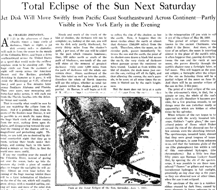 We all remember the total solar eclipse last August, which passed over the United States. June 1918 saw one as well, starting in Washington state and moving southeast until it reached Florida. Actually, it started in a rather unusual way, as this contemporary article described:
