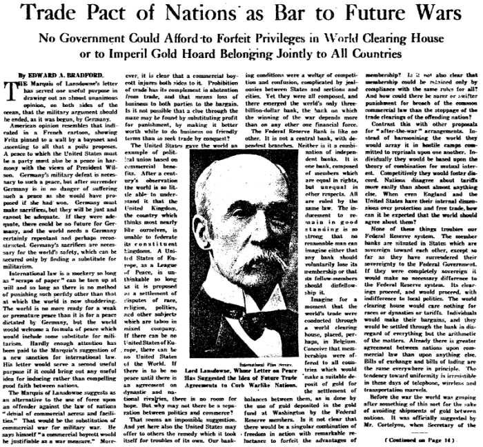 Trade Pact of Nations as Bar to Future Wars: No Government Could Afford to Forfeit Privileges in World Clearing House or to Imperil Gold Hoard Belonging Jointly to All Countries