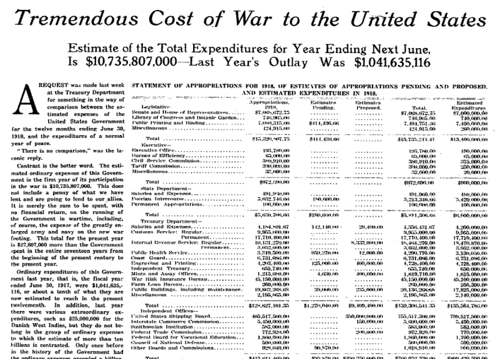 Tremendous Cost of War to the United States: Estimate of the Total Expenditures for Year Ending Next June Is $10,735,807,000 -- Last Year's Outlay Was $1,041,635,116