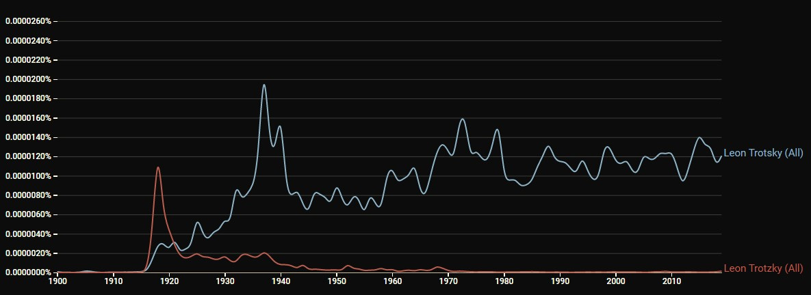 A 1922 New York Times Magazine profile spelled the Soviet Union revolutionary's name Leon Trotzky, with a 'z.' When did the predominant spelling become Leon Trotsky, with an 's'? Google Books' Ngram Viewer allows you to search for the relative popularity of different words or phrases in books over time. The 's' spelling actually first became more frequent in 1921, the year before this 1922 article was published, but the margin was close for a few years. The 's' spelling first exceeded the 'z' spelling by at least double in 1925. In 2019, the most recent year available, the 's' spelling won out by 93x.