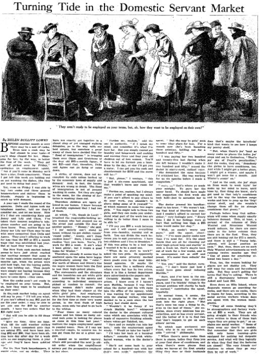 In 1920, New York City "domestic servants" like cooks and houseworkers cost $65 or $75 a month, down from $80 or $90 a year prior. Why? Workforce supply was catching up with customer demand, due to immigration and women losing factory jobs they'd temporarily held during World War I.