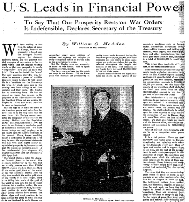 U.S. Leads in Financial Power: To Say That Our Prosperity Rests on War Orders Is Indefensible, Declares Secretary of the Treasury
