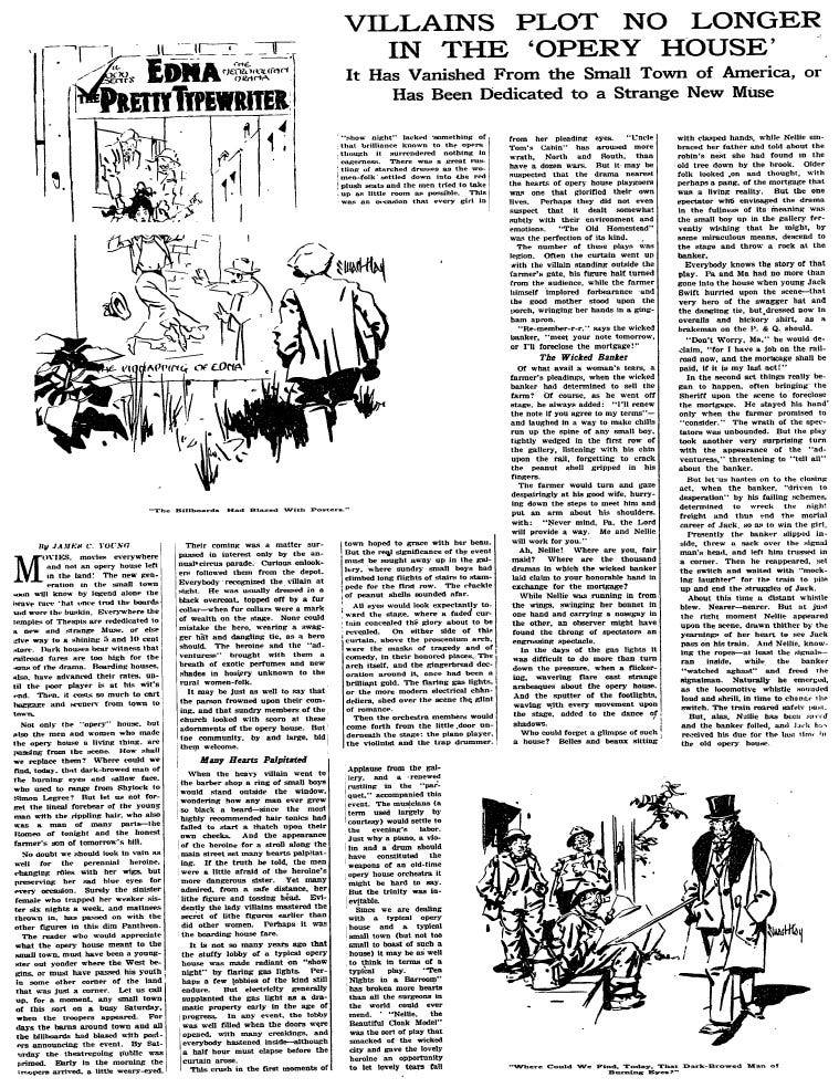Cinemas were replacing that old mainstay of local entertainment: the theater and “opera house,” a 1925 New York Times Magazine article lamented.