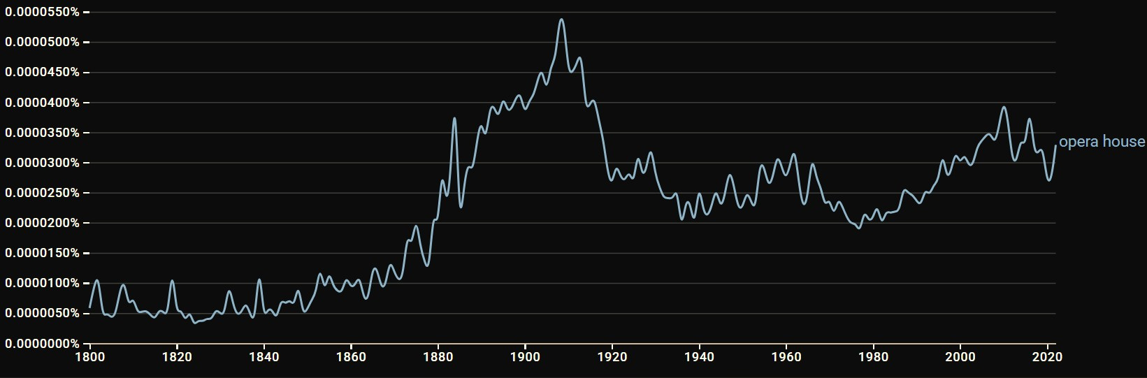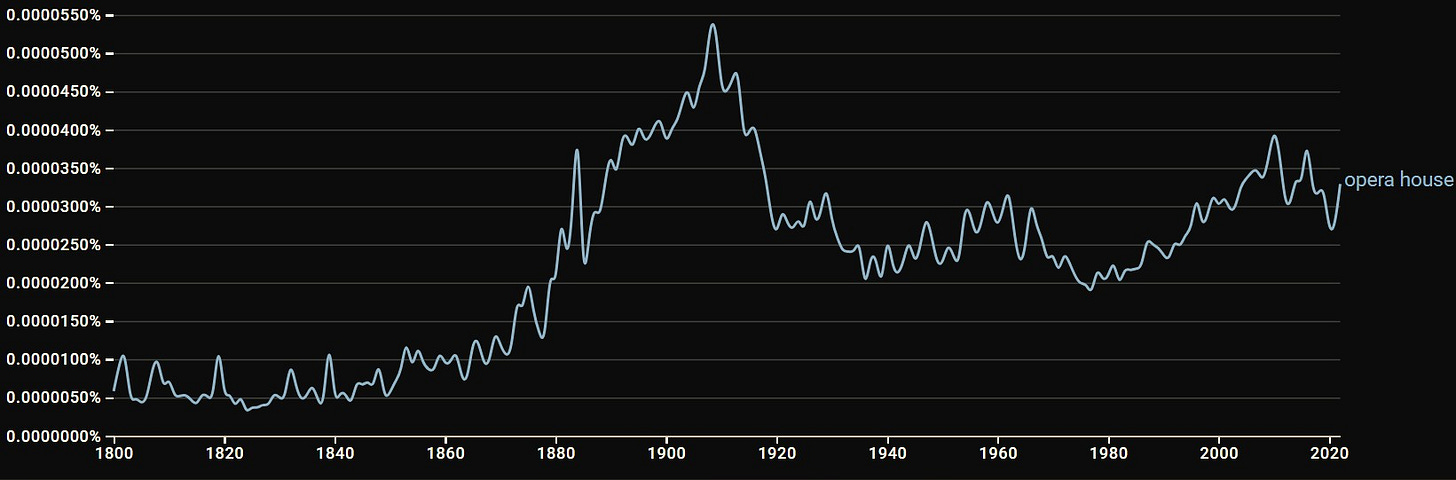 Indeed, according to Google Books Ngram Viewer, use of the phrase “opera house” in books peaked in 1908, declining considerably in the 1910s and 1920s as movies took over.