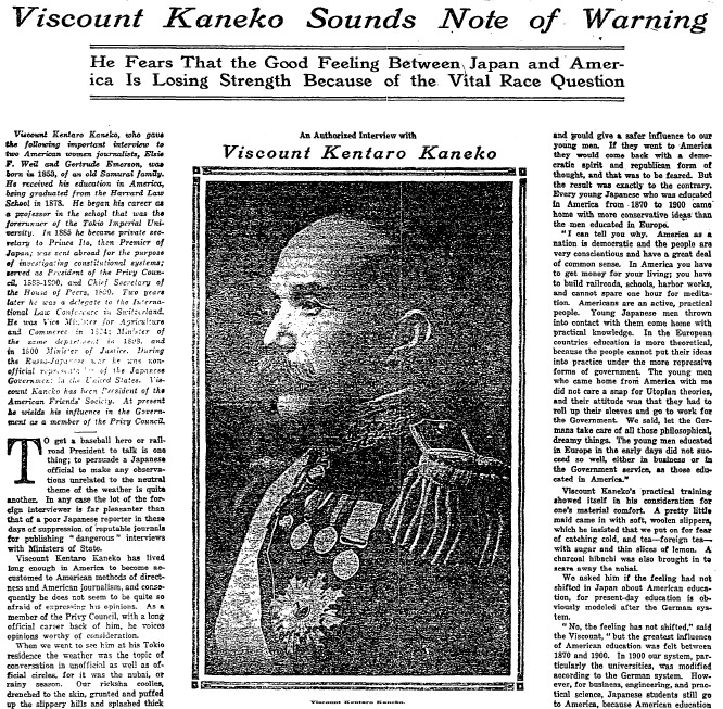 Viscount Kaneko Sounds Note of Warning: He Fears That the Good Feeling Between Japan and America Is Losing Strength Because of the Vital Race Question