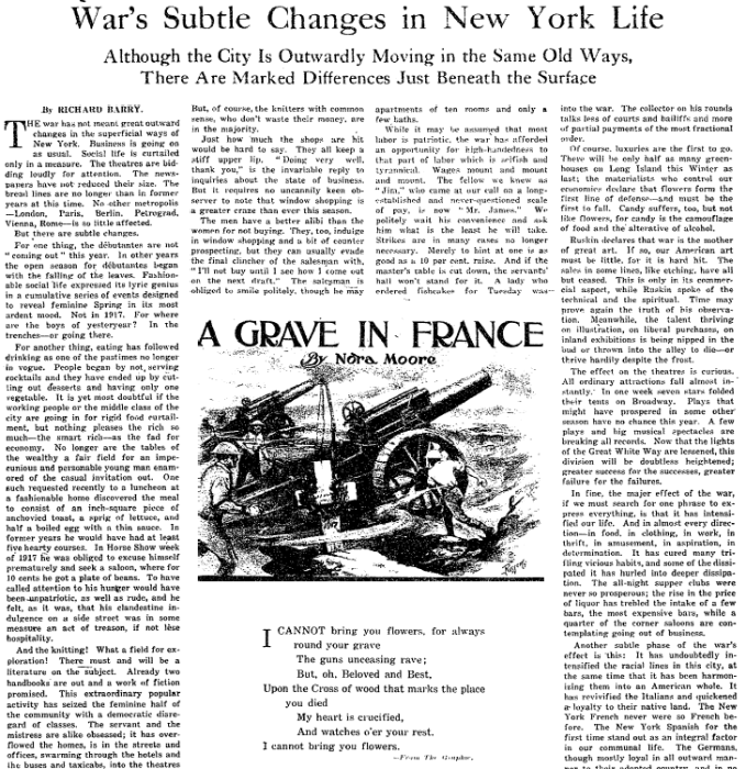 Women weren't wearing as fashionable clothing. "Fashionable social life expressed its lyric genius in a cumulative series of events designed to reveal feminine Spring in its most ardent mood. Not in 1917."