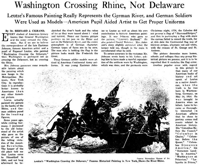 After this 1918 article, the original 1851 painting was destroyed in a 1942 bombing raid, as the original was housed in Germany. The two other versions also painted by Emanuel Gottlieb Leutze are still intact, currently housed at the Met in New York City and the Minnesota Marine Art Museum.