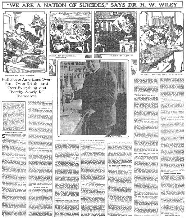 "WE ARE A NATION OF SUICIDES," SAYS DR. H. W. WILEY: He Believes Americans Over-Eat, Over-Drink and Over-Everything and Thereby Slowly Kill Themselves. (PDF)