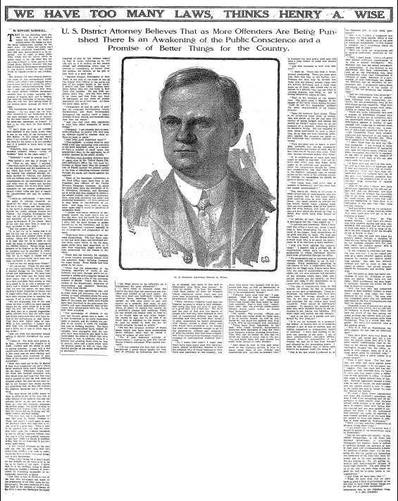 WE HAVE TOO MANY LAWS, THINKS HENRY A. WISE: U.S. District Attorney Believes That as More Offenders Are Being Punished There is an Awakening of the Public Conscience and a Promise of Better Things for the Country. (PDF)