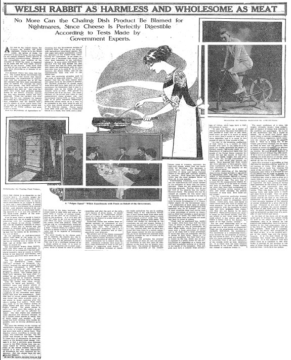 WELSH RABBIT AS HARMLESS AND WHOLESOME AS MEAT: No More Can the Chafing Dish Product Be Blamed for Nightmares, Since Cheese Is Perfectly Digestible According to Tests Made by Government Experts (PDF)