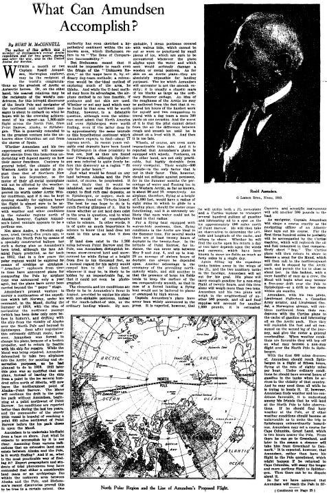 The article's final paragraph estimated that Amundsen's odds were about 6:1 against. Indeed, the trip failed, as Amundsen abandoned the attempt when his plane became damaged. But his subsequent attempt in 1926 proved successful, the first such trans-Arctic aerial flight.