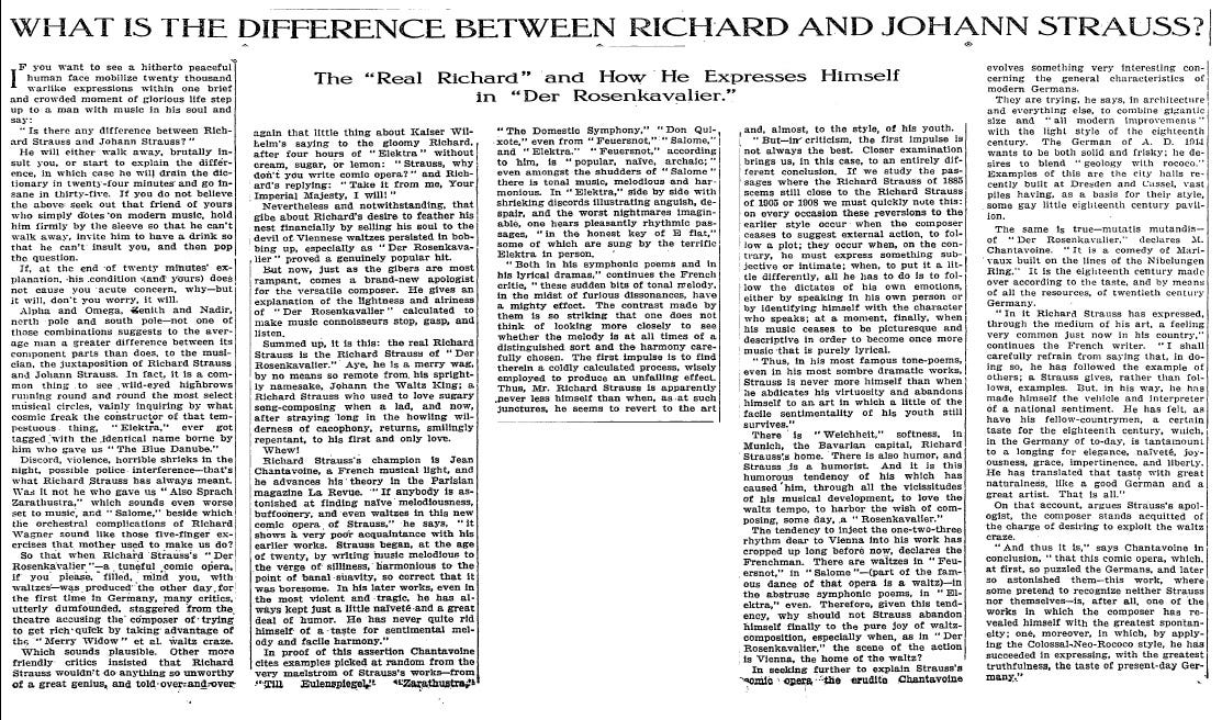 Alpha and Omega, Zenith and Nadir, north pole and south pole -- not one of those combinations suggests to the average man a greater difference between its component parts than does, to the musician, the juxtaposition of Richard Strauss and Johann Strauss. In fact, it is a common thing to see wild-eyed highbrows running round and round the most select musical circles, vainly inquiring by what cosmic freak the constructor of that tempestuous thing, "Elektra," ever got tagged with the identical name borne by him who gave us "The Blue Danube."