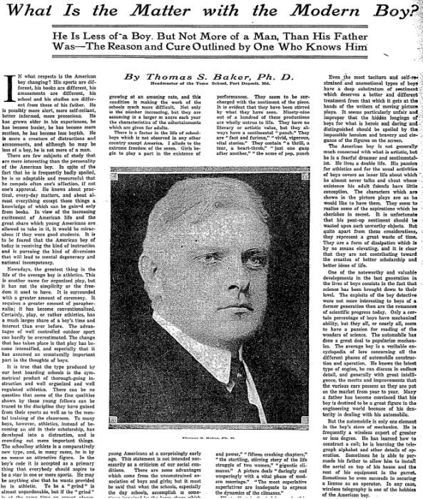 In the words of the musical Bye Bye Birdie, "What's the Matter With Kids Today?" They've been asking that question for ages, and in 1916 a boys' school headmaster named Thomas S. Baker continued that storied tradition. He laid the blame for the modern boy at several primary culprits including the rise in popularity of sports and movies during the previous generation.