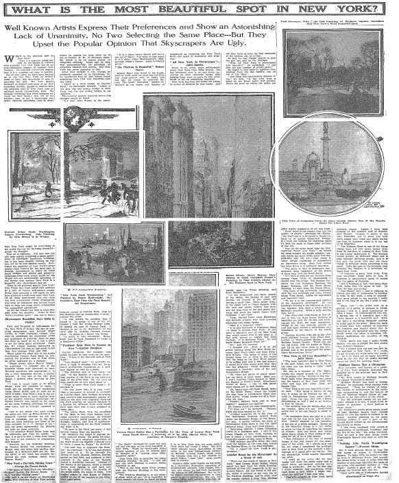 WHAT IS THE MOST BEAUTIFUL SPOT IN NEW YORK? Well Known Artists Express Their Preferences and Show an Astonishing Lack of Unanimity, No Two Selecting the Same Place -- But They Upset the Popular Opinion That Skyscrapers Are Ugly. (PDF)