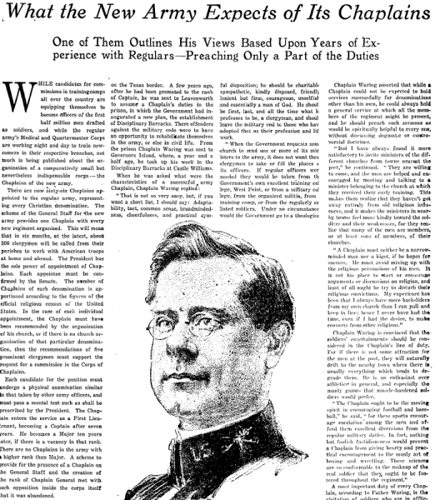 "There are now sixty-six chaplains appointed to the regular army, representing every Christian denomination. The scheme of the General Staff for the new army provides one Chaplain with every new regiment ordered. This will mean that in six months, at the latest, about 300 clergymen will be called from their parishes to work with American troops at home and abroad."