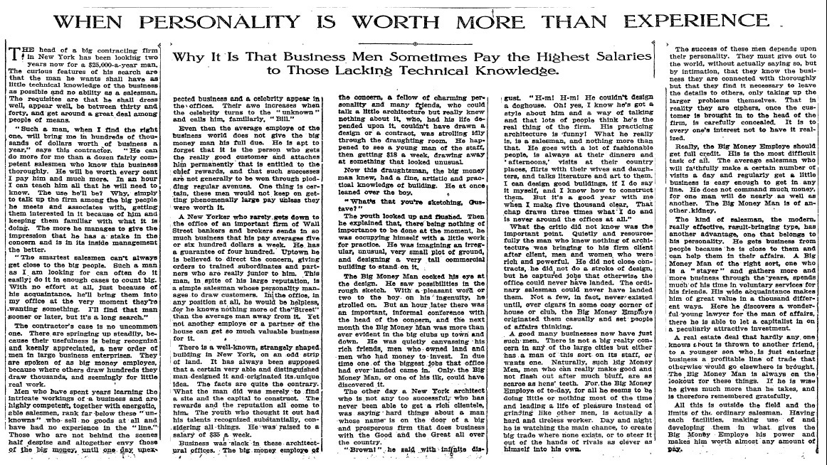 WHEN PERSONALITY IS WORTH MORE THAN EXPERIENCE: Why It Is That Business Men Sometimes Pay the Highest Salaries to Those Lacking Technical Knowledge. (PDF)