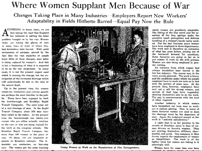 Among the jobs which were women were filling in for men in larger numbers as a result of World War I: streetcar conductors, subway guards, elevator runners, firefighters, munition works, the felt hat industry, radium plating, and wagon drivers.
