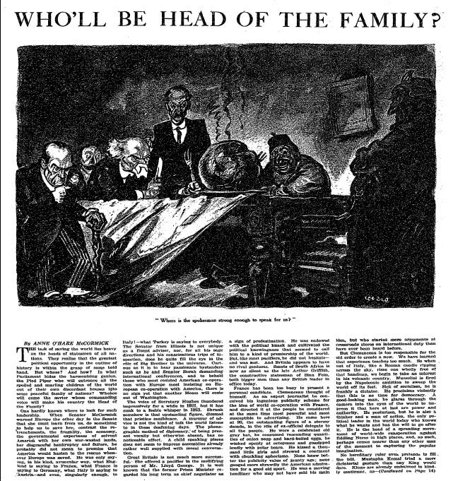 In February 1923, New York Times Magazine asked: who should be considered the preeminent moral leader of the western world? For various reasons, writer Anne O'Hare McCormick cast doubt on then-leaders in the U.S., U.K., France, and even the pope.