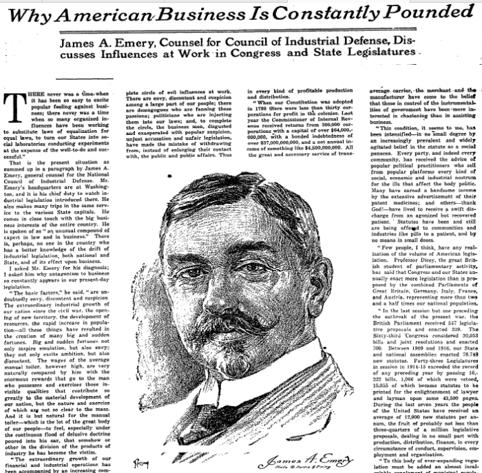 Why American Business Is Constantly Pounded: James A. Emery, Counsel for Council of Industrial Defense, Discusses Influences at Work in Congress and State Legislatures