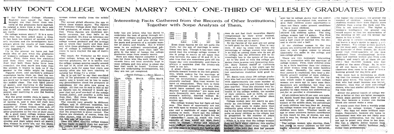 WHY DON'T COLLEGE WOMEN MARRY? ONLY ONE-THIRD OF WELLESLEY GRADUATES WED: Interesting Facts Gathered from the Records of Other Institutions, Together with Some Analysis of Them. (PDF)