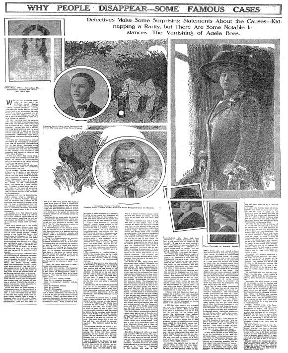 WHY PEOPLE DISAPPEAR -- SOME FAMOUS CASES: Detectives Make Some Surprising Statements About the Causes -- Kidnapping a Rarity, but There Are Some Notable Instances -- The Vanishing of Adele Boas. (PDF)