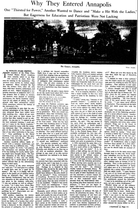 The new boys at the U.S. Naval Academy were surveyed in 1919 about why they had joined, and their answers varied considerably. Five favorites:
