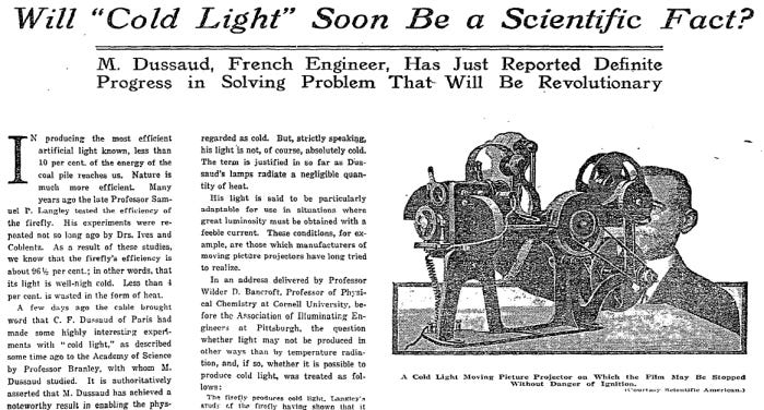 Will 'Cold Light' Soon Be a Scientific Fact?: M. Dussaud, French Engineer, Has Just Reported Definite Progress in Solving Problem That Will Be Revolutionary