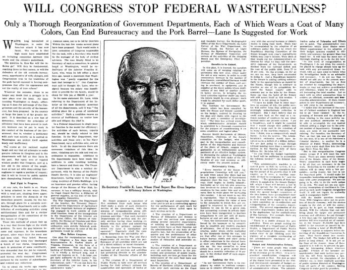 So a proposed 1920 committee to reorganize the government was suggested, hopefully to be headed by former Secretary of the Interior Franklin Knight Lane, who had resigned mere weeks prior "because his salary was insufficient to provide for his family."