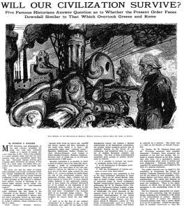 In 1925, New York Times Magazine asked historians if Western civilization was showing signs akin to those which brought down the Roman, Greek, or Egyptian Empires. Headline: “Will Our Civilization Survive?”
