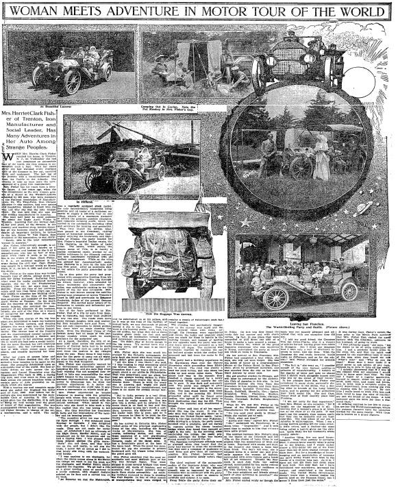 WOMAN MEETS ADVENTURE IN MOTOR TOUR OF THE WORLD: Mrs. Harriet Clark Fisher of Trenton, Iron Manufacturer and Social Leader, Has Many Adventures in Her Auto Among Strange Peoples. (PDF)