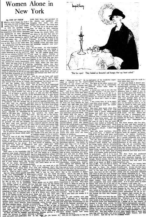 Amid a rise in unmarried women, and two years after women were granted the constitutional right to vote, a 1922 New York Times Magazine article profiled "Women Alone in New York." The byline was "By one of them."