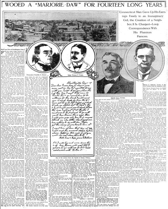 WOOED A "MARJORIE DAW" FOR FOURTEEN LONG YEARS: Connecticut man Gave Up His Earnings Freely to an Immaginary Girl, the Creation of a Neighbor, It Is Charged -- Long Correspondence With His Phantom Fiancee. (PDF)