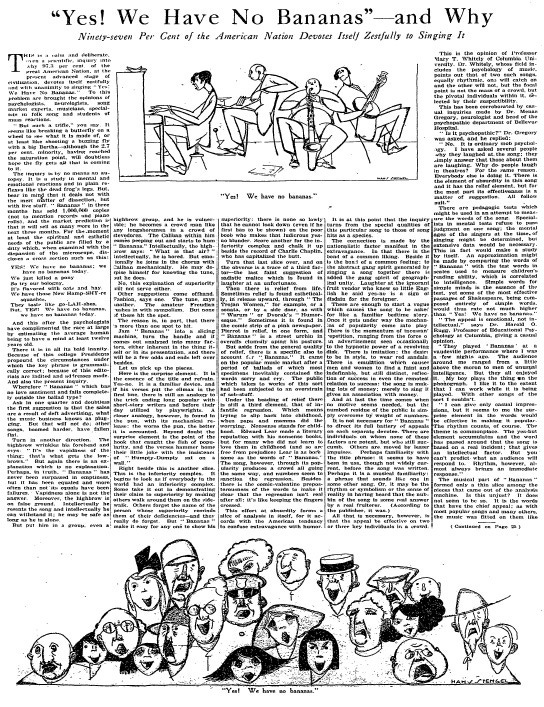 Why was Yes! We Have No Bananas so popular? An August 1923 New York Times Magazine article detailed several possible explanations. Most of them are still obvious to modern ears, like the wackiness of the lyrics, but others were more unique to the time: