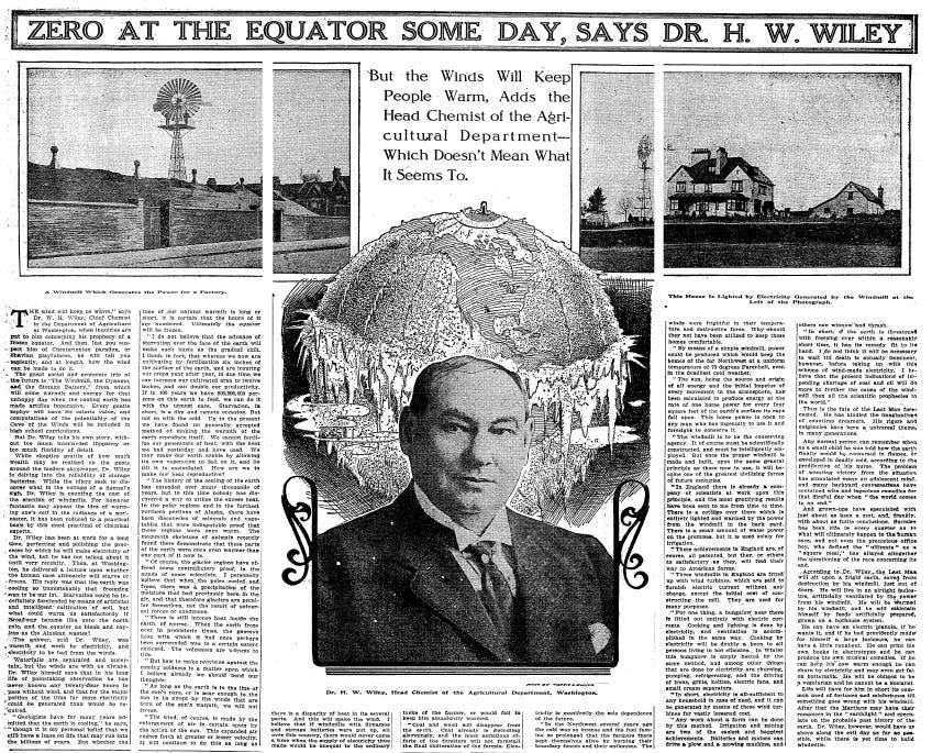 H. W. Wiley of the US Agricultural Department is worried that the world is cooling. But he has a plan: windmills.